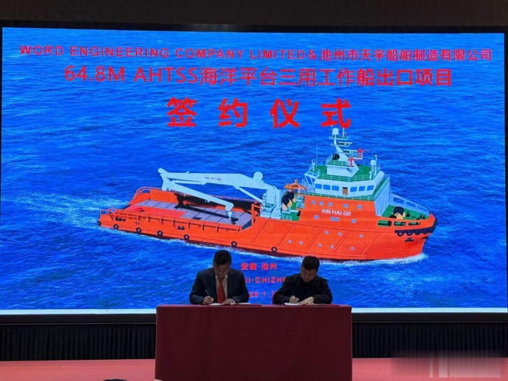 据池州市经济和信息化局消息,日前,池州市天宇船舶制造有限公司与香港沃德工程有限公司成功签订64.8米AHTSS海洋平台三用工作船建造协议。这是贵池船舶工业基地2026年斩获的首个外贸船舶订单,标志着该基地在高端海工装备制造领域迈出新步伐。