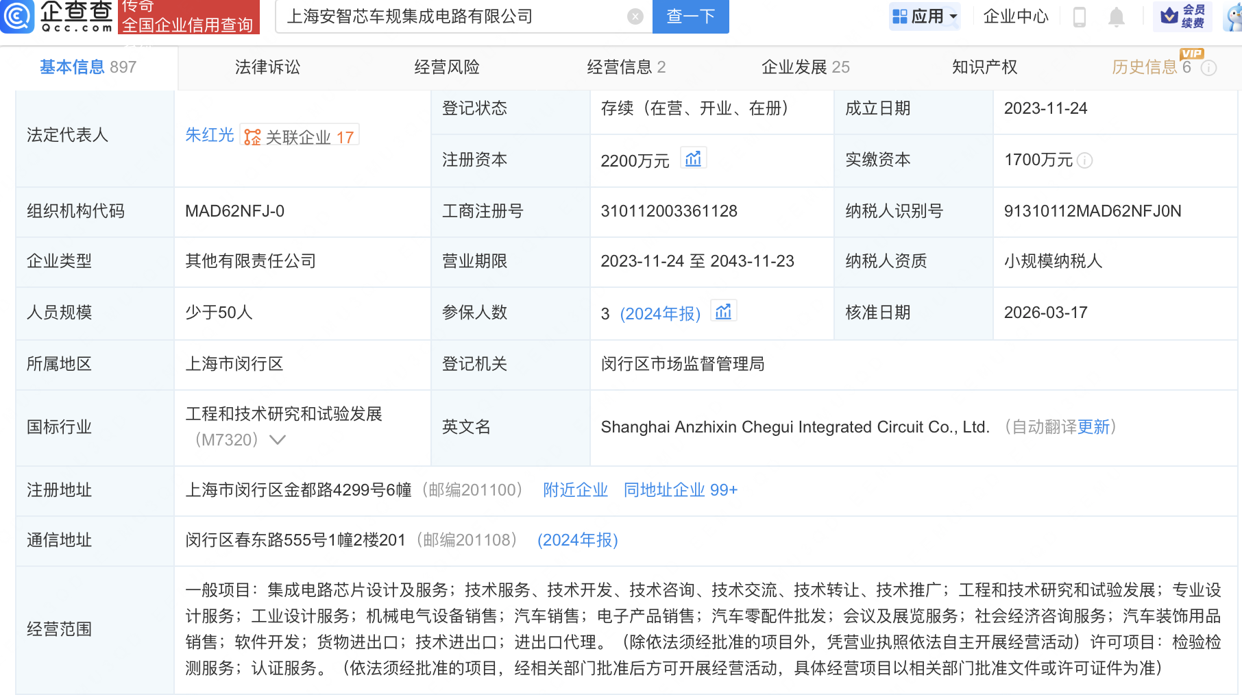 近日,上海安智芯车规集成电路有限公司发生工商变更,新增铭科精技(001319)、斯达半导(603290)等为股东,同时注册资本增至2200万元。企查查信息显示,该公司成立于2023年,经营范围包含:集成电路芯片设计及服务;汽车销售;电子产品销售;汽车零配件批发等。